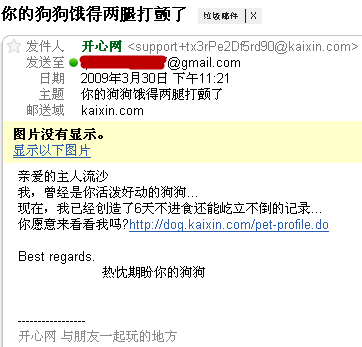 應該是開心網(kaixin.com)的寵物功能又升級了,這幾次發(fā)來的郵件內容不僅不能讓我開心,反而讓我覺得很惡心。