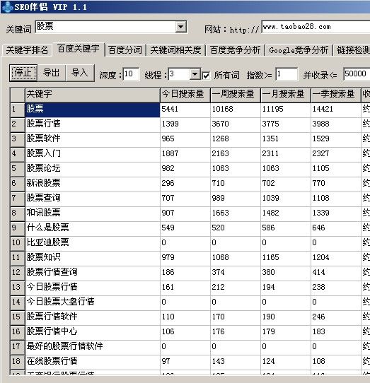 以前百度會提供相關(guān)搜索更多頁面,但是后來被百度關(guān)閉了,只有競價用戶才能看到,這部門關(guān)鍵字數(shù)據(jù)是非常有用的,之后便產(chǎn)生了很多的關(guān)鍵字選取軟件,軟件的數(shù)據(jù)來源是百度指數(shù),也就是原先的相關(guān)搜索,比如最常見的有SEO伴侶,SEO助手(這兩款都是付費軟件)免費的也可以用,但是出來的關(guān)鍵字很少,而且可能還被禁止導(dǎo)出,SEO伴侶我一直在用,價格一年也就幾十元,我記得好像是35元!SEO助手價格相對比較貴,但是里面除了這個功能外,其他功能還有很多,還有最新的一個網(wǎng)站叫追詞網(wǎng)(http://www.zhuici.com/ )這個網(wǎng)站不需要給錢,但是需要用一個PR=3的鏈接換取VIP會員級別,有資源的可以去用一下!下面我以SEO伴侶為示范,找出“股票”相關(guān)的關(guān)鍵字~~