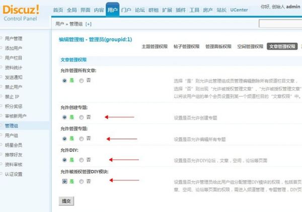 允許被授權(quán)管理文章:設(shè)置是否允許管理員給此用戶組單個(gè)成員分配管理一個(gè)或多個(gè)頻道欄目文章的權(quán)限,需進(jìn)入頻道欄目進(jìn)行單獨(dú)設(shè)置;允許創(chuàng)建專題:設(shè)置是否允許創(chuàng)建專題;允許管理專題:設(shè)置是否允許編輯所有專題;允許DIY:設(shè)置是否允許DIY論壇,文章,空間,論壇等頁面;允許被授權(quán)管理DIY模塊:設(shè)置是否允許管理員給此用戶組分配管理DIY模塊的權(quán)限,包括首頁、頻道、專題、文章、空間、論壇等頁面的權(quán)限,需進(jìn)入頻道管理,專題管理,DIY頁面管理進(jìn)行分別設(shè)置。